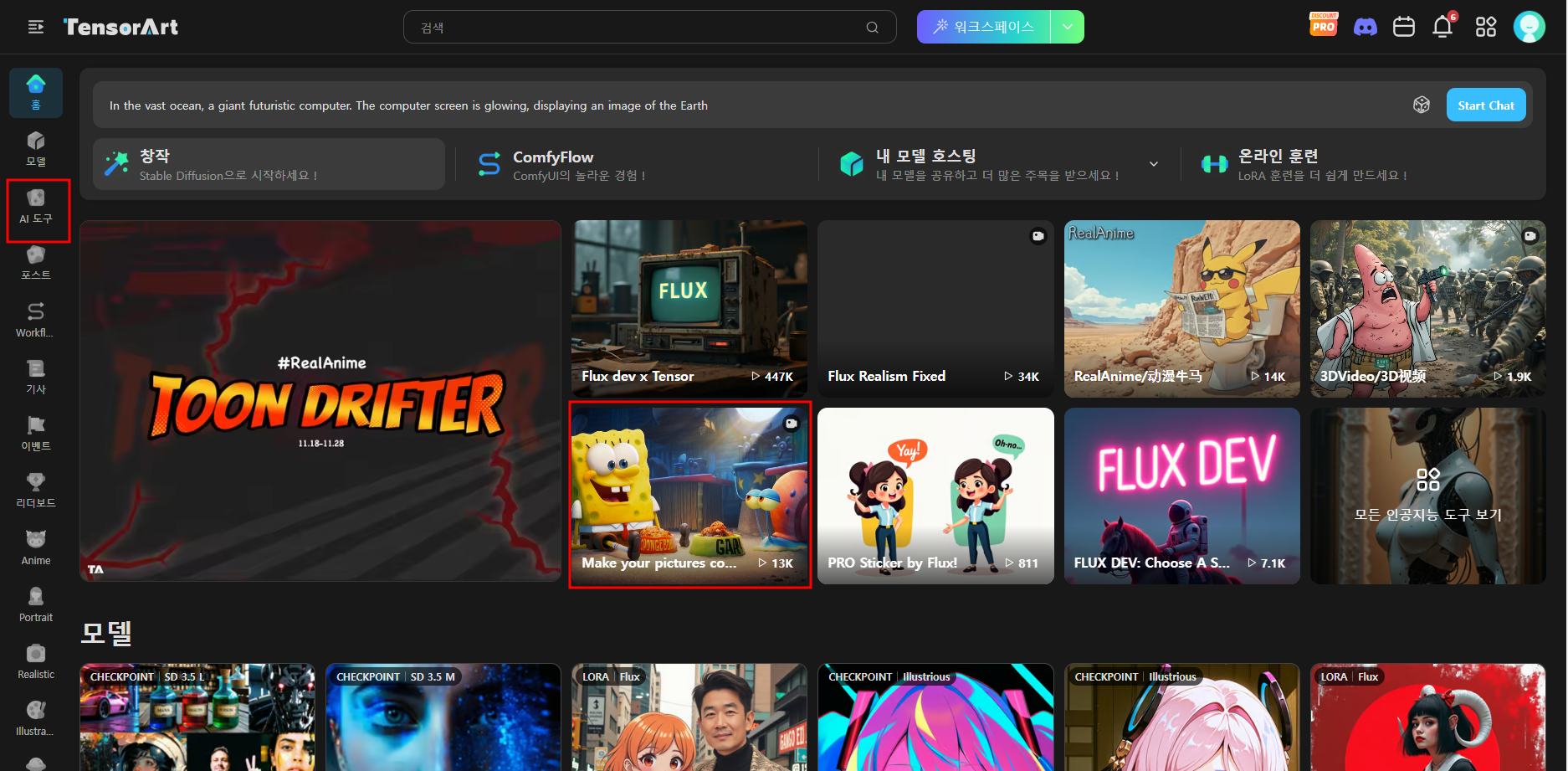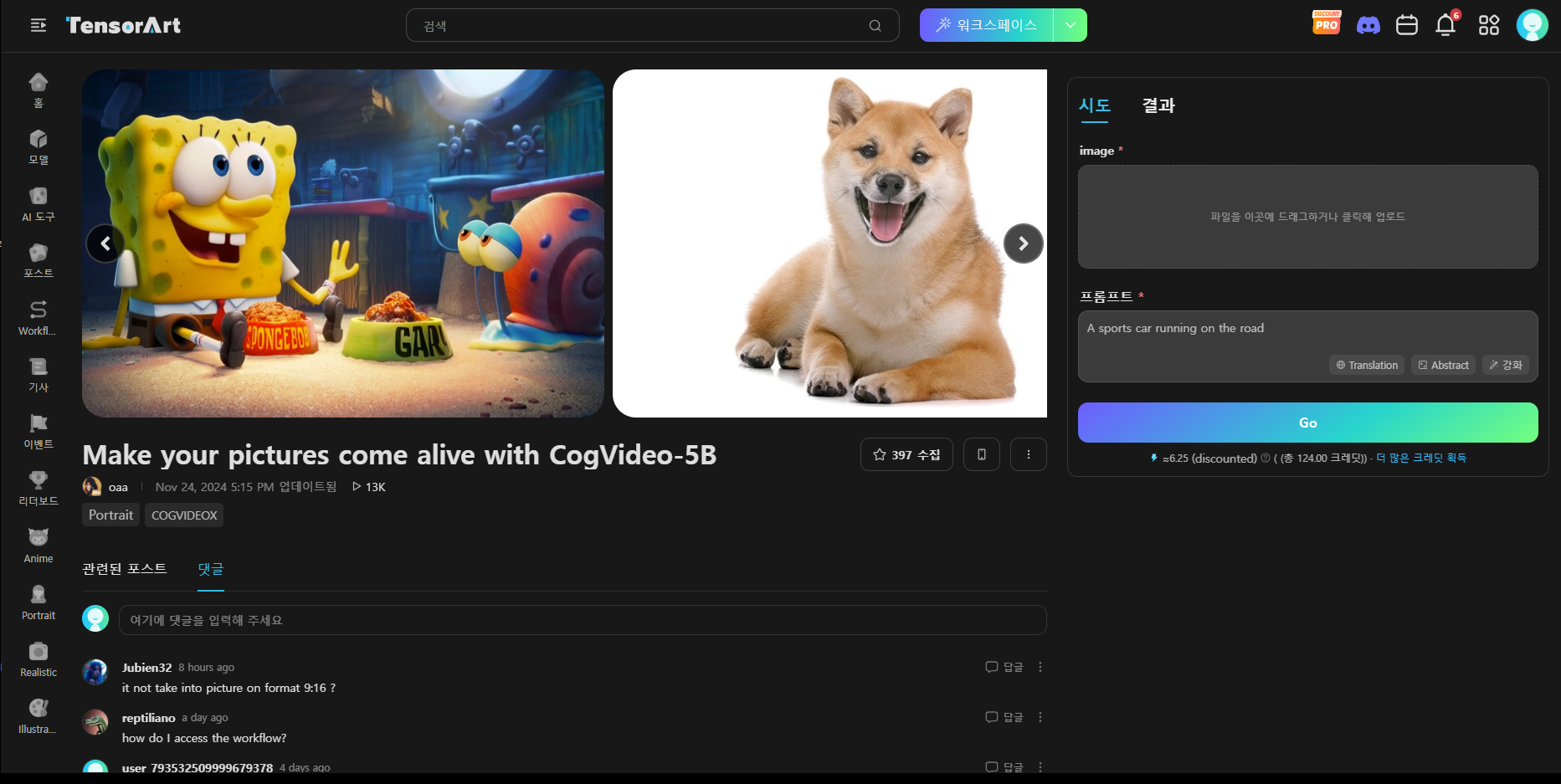 일전에 소개해드렸던 Tensor.Art 텐서아트 사이트 내에 재미있는 기능이 많이 생겨서 소개해드릴까 합니다. 위의 화면 이미지 왼쪽 붉은 사각형에 'AI 도구' 라는 메뉴인데 Tensor.Art 텐서아트가 특정 커스텀노드, 모델, 노라를 쉽게 사용할 수 있도록 사이트내에 별도로 메뉴화한 것인데요. 이 중 중간의 스펀지밥 이미지를 클릭하시면 간단하게 Image to Video 를 통해 영상을 생성할 수 있습니다. 최근 영상생성부분에서 관심을 받고 있는 몇가지 오픈소스들 중 꽤 예전부터 업그레이드를 해온 CogVideo-5B 모델로 생성해볼 수 있는 기능입니다.