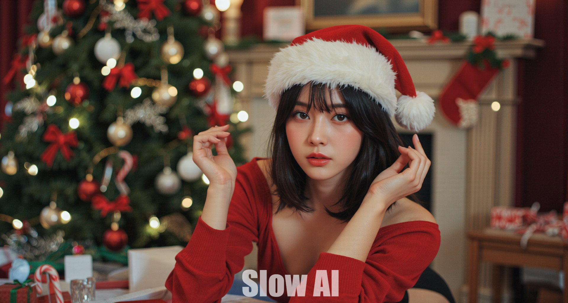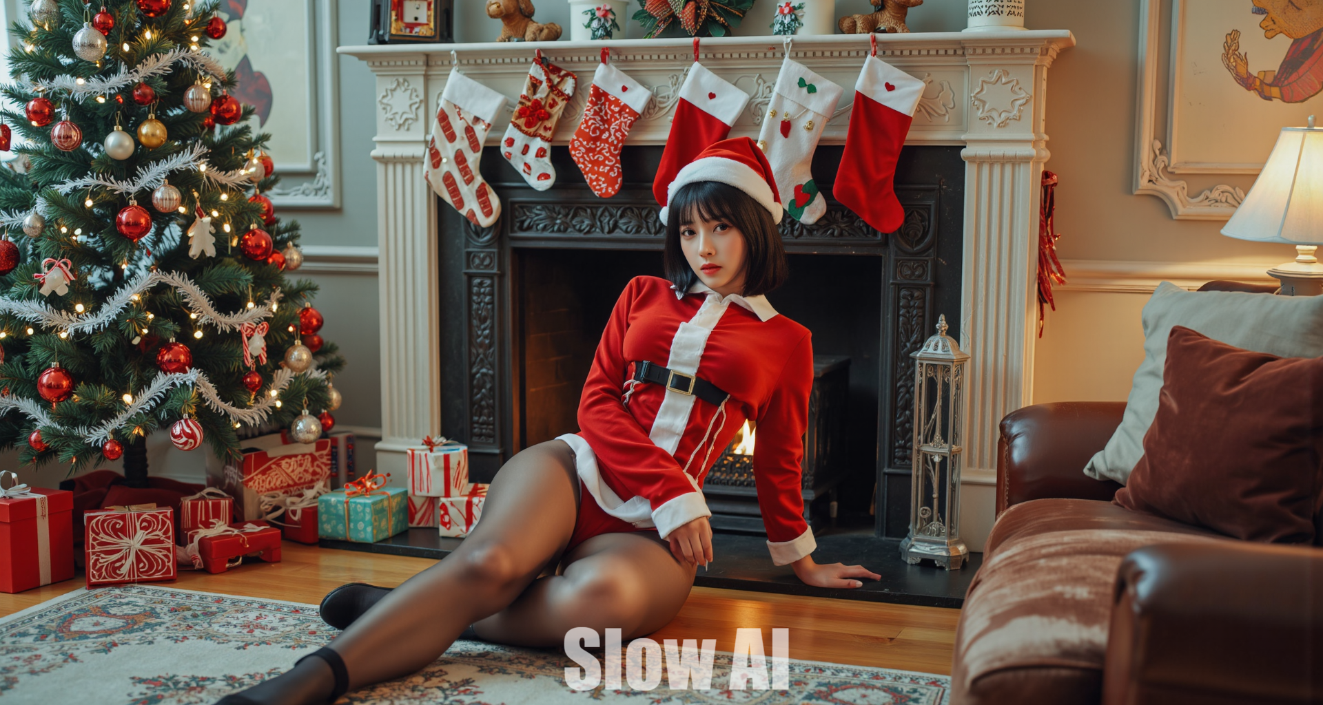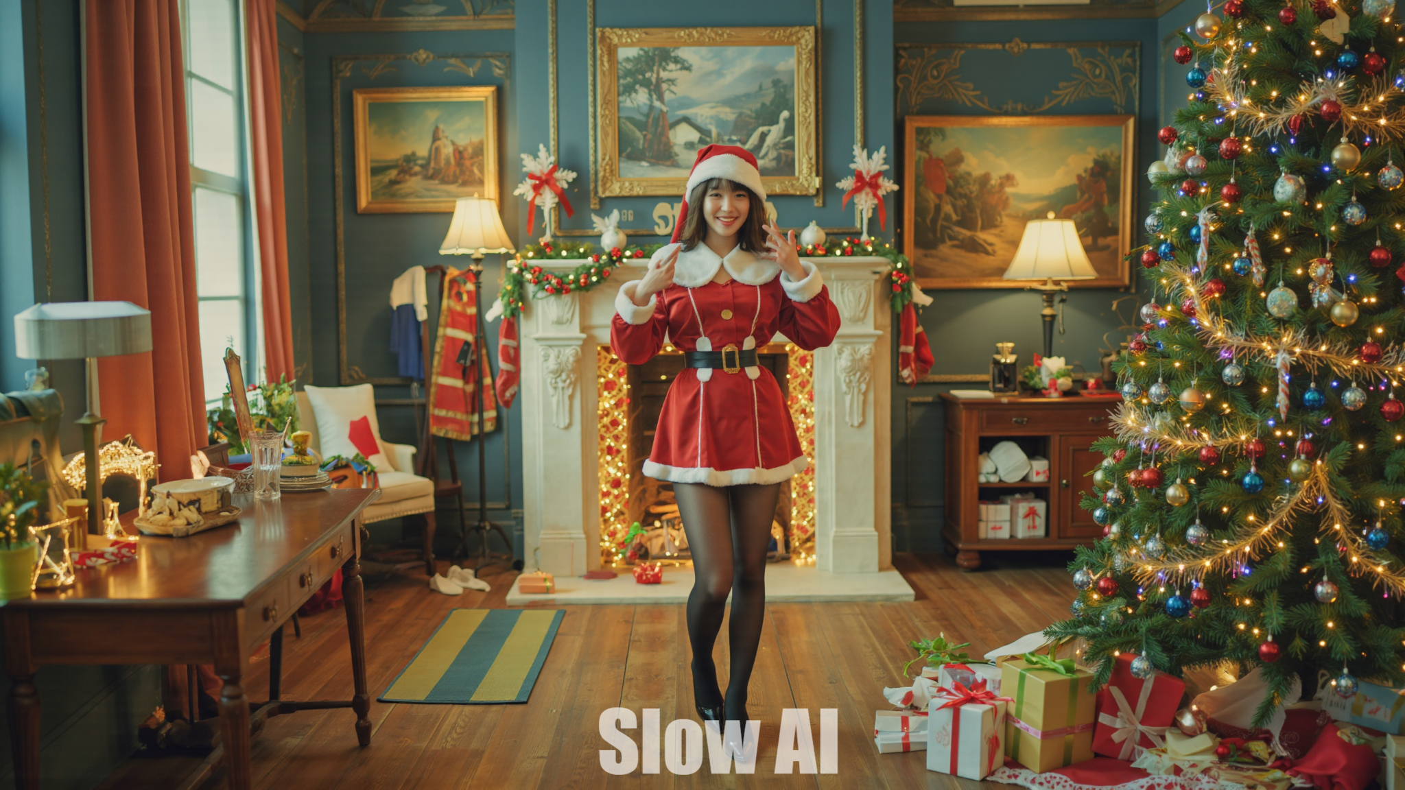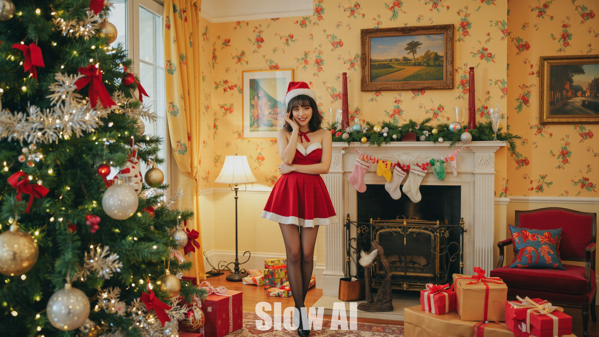 아늑한 거실, 크리스마스트리, 산타걸