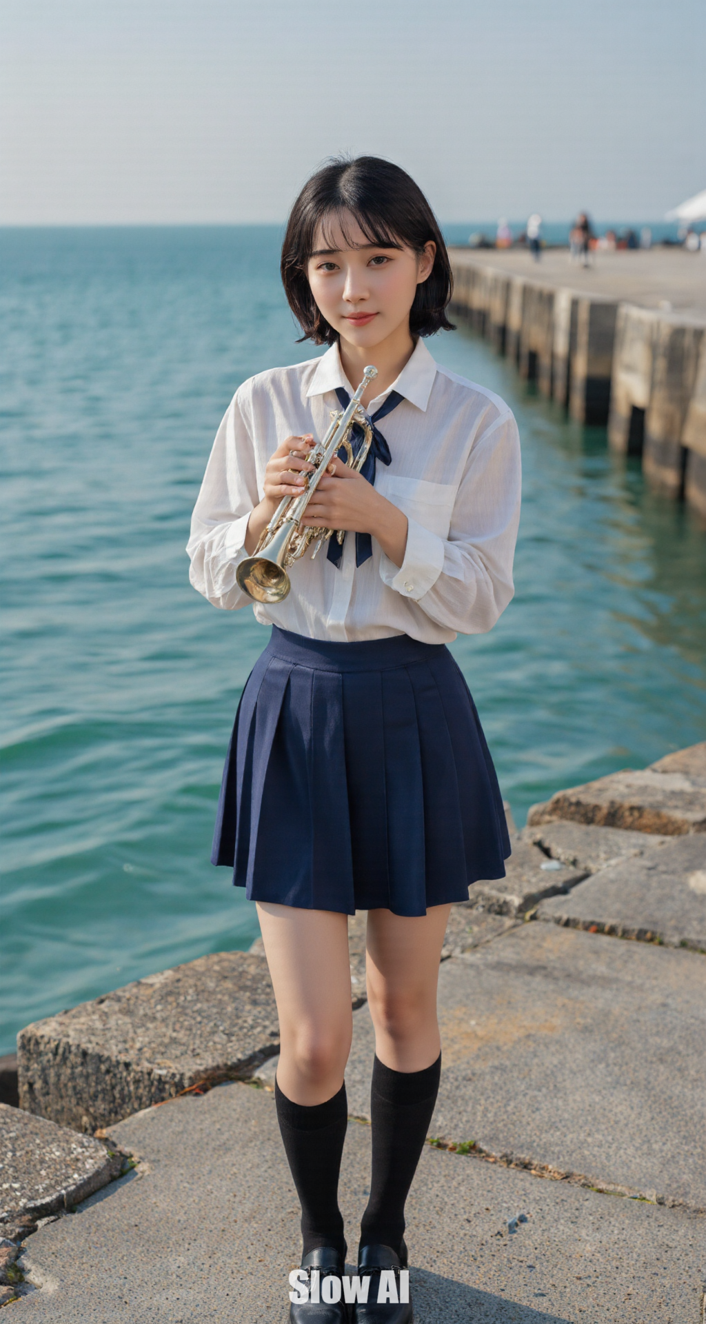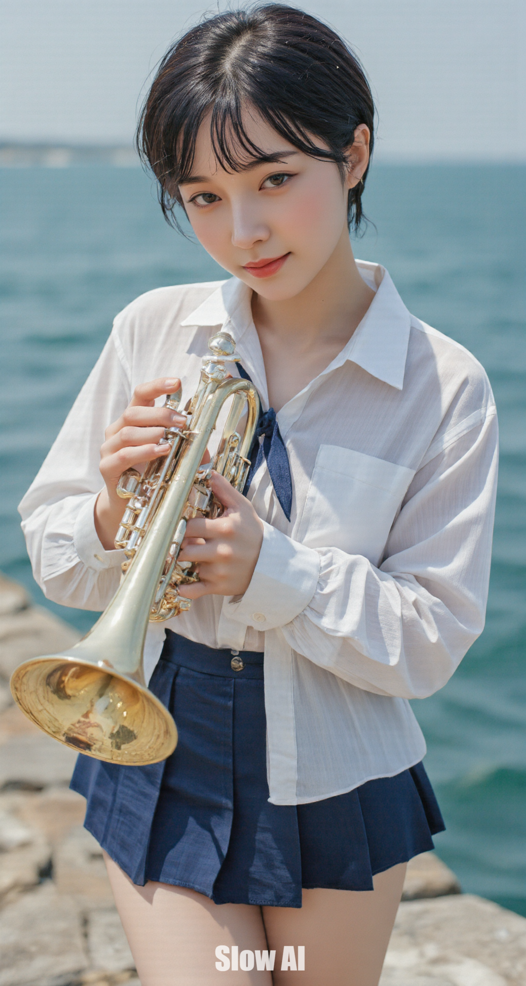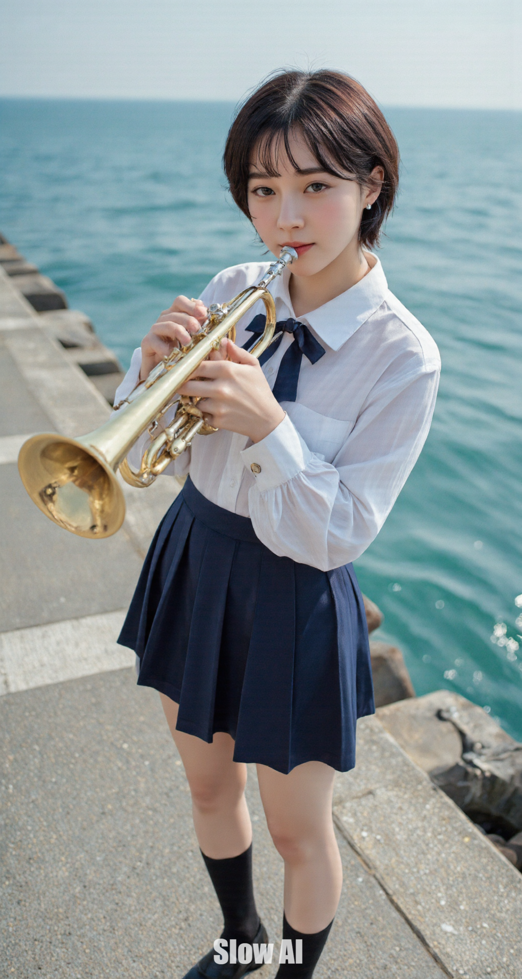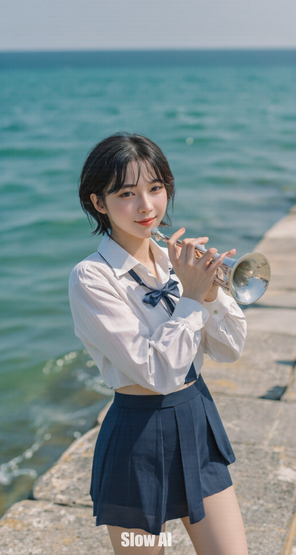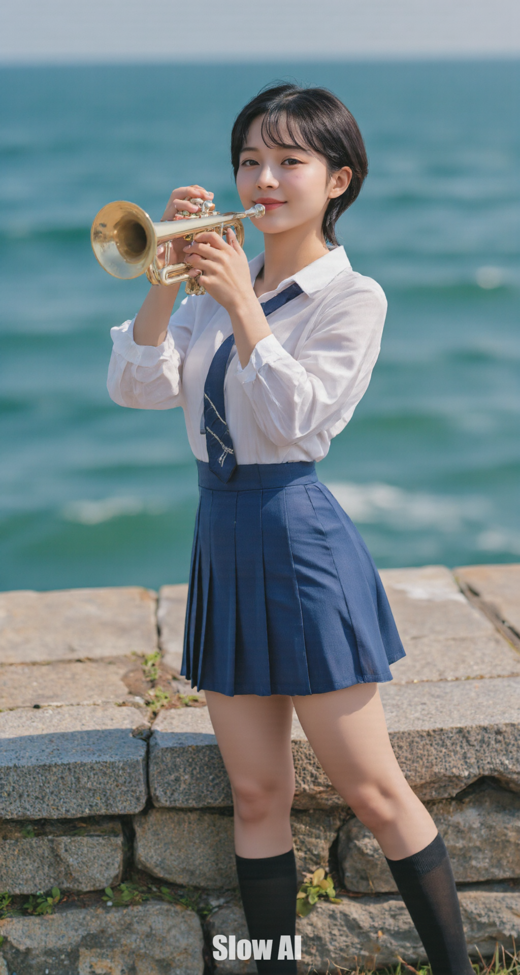 바다가의 오래된 방파제에서 트럼펫을 부는 소녀의 이미지를 생성해보고 싶었습니다.